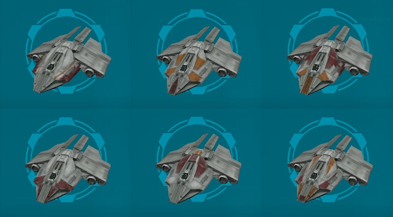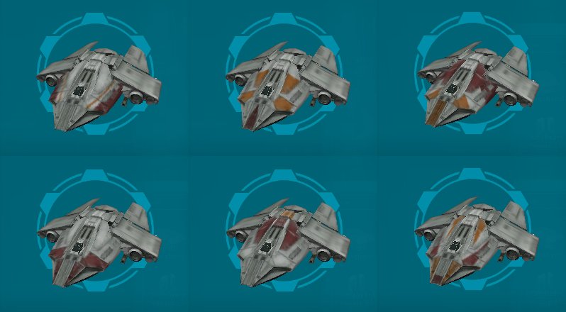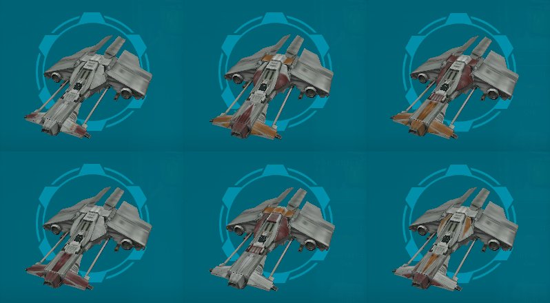 As with all Black Sun fighters, only the detailing can be changed, and the main portion of the hull remains the "silver" or bare metal. In the images below, the Primary color appears as red, and the Secondary as orange. Note that for some reason, the default colors for this hull are red and white, instead of orange, and I changed those colors for these images. White actually matches the base hull color fairly well, and so those parts of the design are "hidden" until you explicitly paint them.
